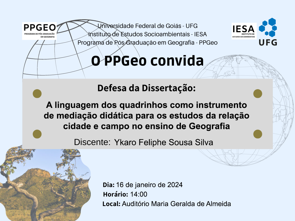 O Programa de Pós-Graduação em Geografia convida a todas e todos para a banca de Defesa de Dissertação de Mestrado de Ykaro Feliphe Sousa Silva, intitulada "A linguagem dos quadrinhos como instrumento de mediação didática para os estudos da relação cidade e campo no ensino de Geografia".
