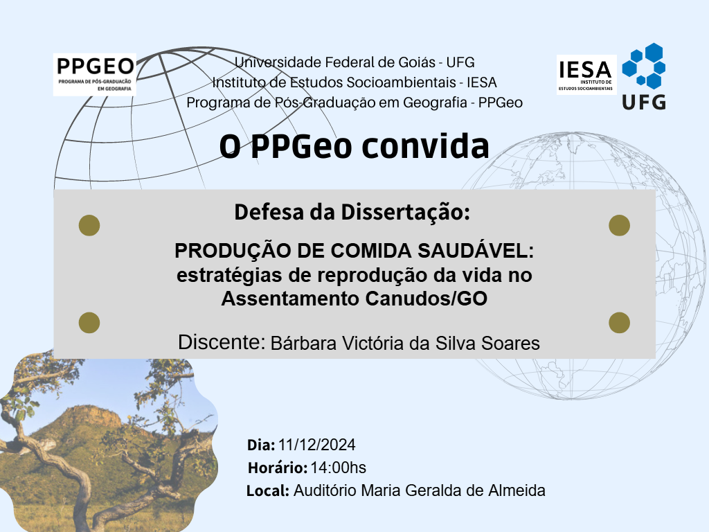 O Programa de Pós-Graduação em Geografia convida a todas e todos para a banca de Defesa de Dissertação de Mestrado de Bárbara Victória da Silva Soares, intitulada "“PRODUÇÃO DE COMIDA SAUDÁVEL: estratégias de reprodução da vida no Assentamento Canudos/GO".
