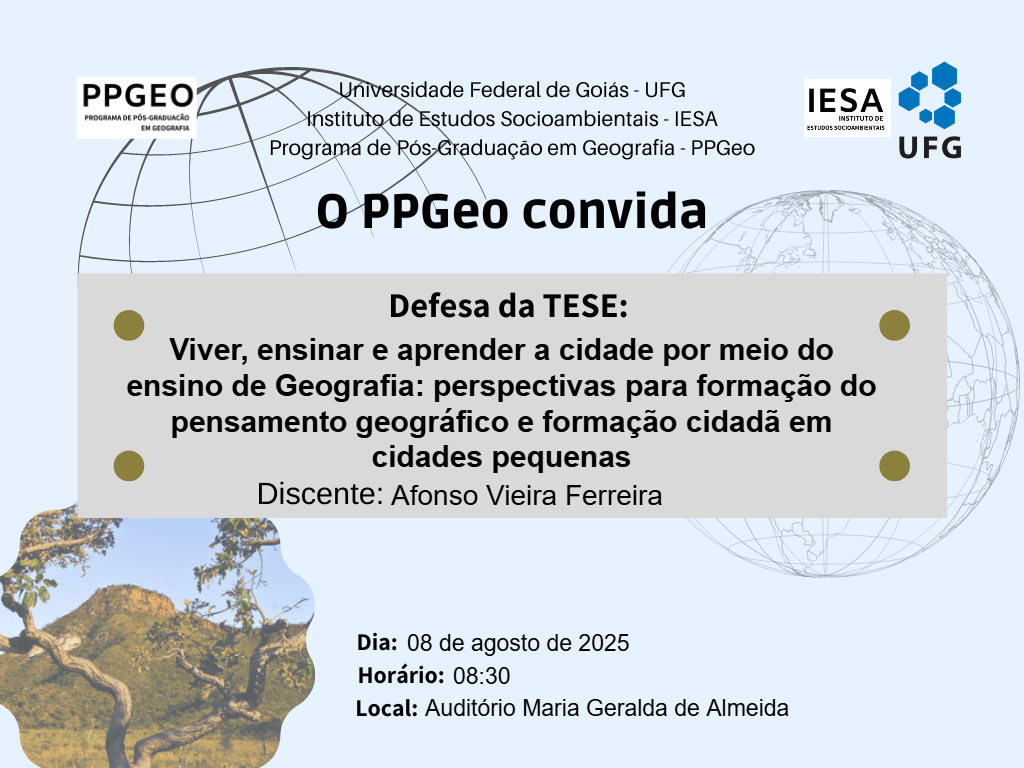 O Programa de Pós-Graduação em Geografia da Universidade Federal de Goiás convida a todas e todos para a banca de Defesa de Tese de Afonso Vieira Ferreira, intitulada “Viver, ensinar e aprender a cidade por meio do ensino de Geografia: perspectivas para formação do pensamento geográfico e formação cidadã em cidades pequenas".