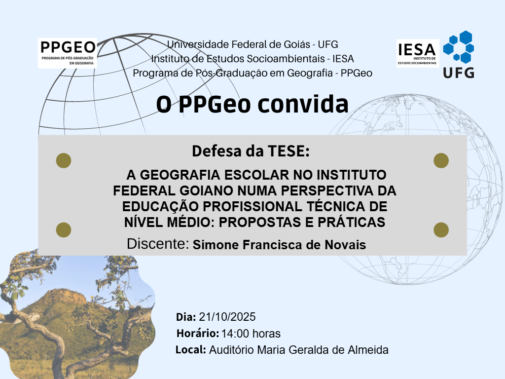 O Programa de Pós-Graduação em Geografia da Universidade Federal de Goiás convida a todas e todos para a banca de Defesa de Tese de Simone Farncisca de Novais, intitulada "A GEOGRAFIA ESCOLAR NO INSTITUTO FEDERAL GOIANO NUMA PERSPECTIVA DA EDUCAÇÃO PROFISSIONAL TÉCNICA DE NÍVEL MÉDIO: PROPOSTAS E PRÁTICAS".