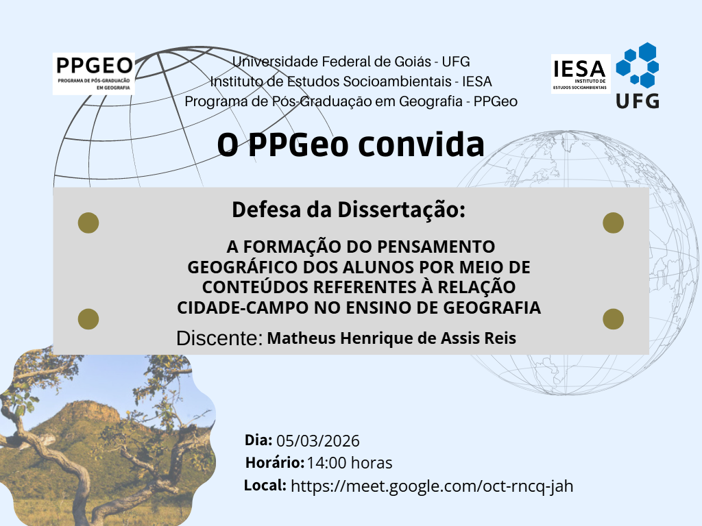O Programa de Pós-Graduação em Geografia da Universidade Federal de Goiás convida a todas e todos para a banca de Defesa de Dissertação de Mestrado de Matheus Henrique de Assis Reis, intitulada “A FORMAÇÃO DO PENSAMENTO GEOGRÁFICO DOS ALUNOS POR MEIO DE CONTEÚDOS REFERENTES À RELAÇÃO CIDADE-CAMPO NO ENSINO DE GEOGRAFIA”.