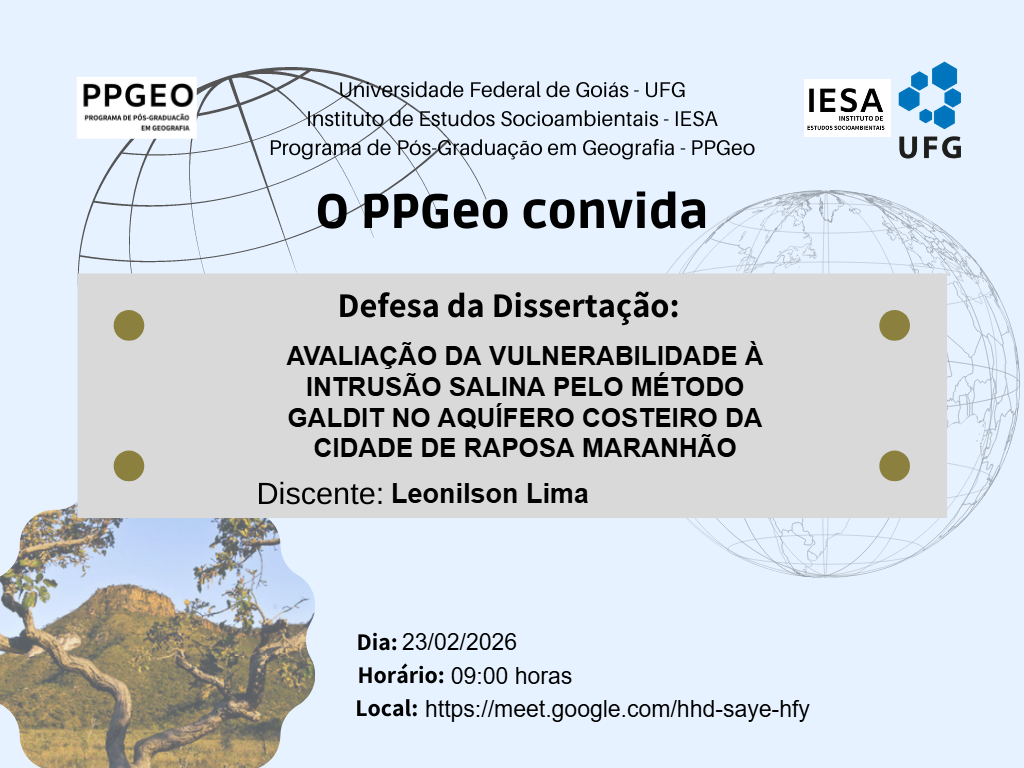 O Programa de Pós-Graduação em Geografia da Universidade Federal de Goiás convida a todas e todos para a banca de Defesa de Dissertação de Mestrado de Leonilson Lima, intitulada "AVALIAÇÃO DA VULNERABILIDADE À INTRUSÃO SALINA PELO MÉTODO GALDIT NO AQUÍFERO COSTEIRO DA CIDADE DE RAPOSA MARANHÃO".